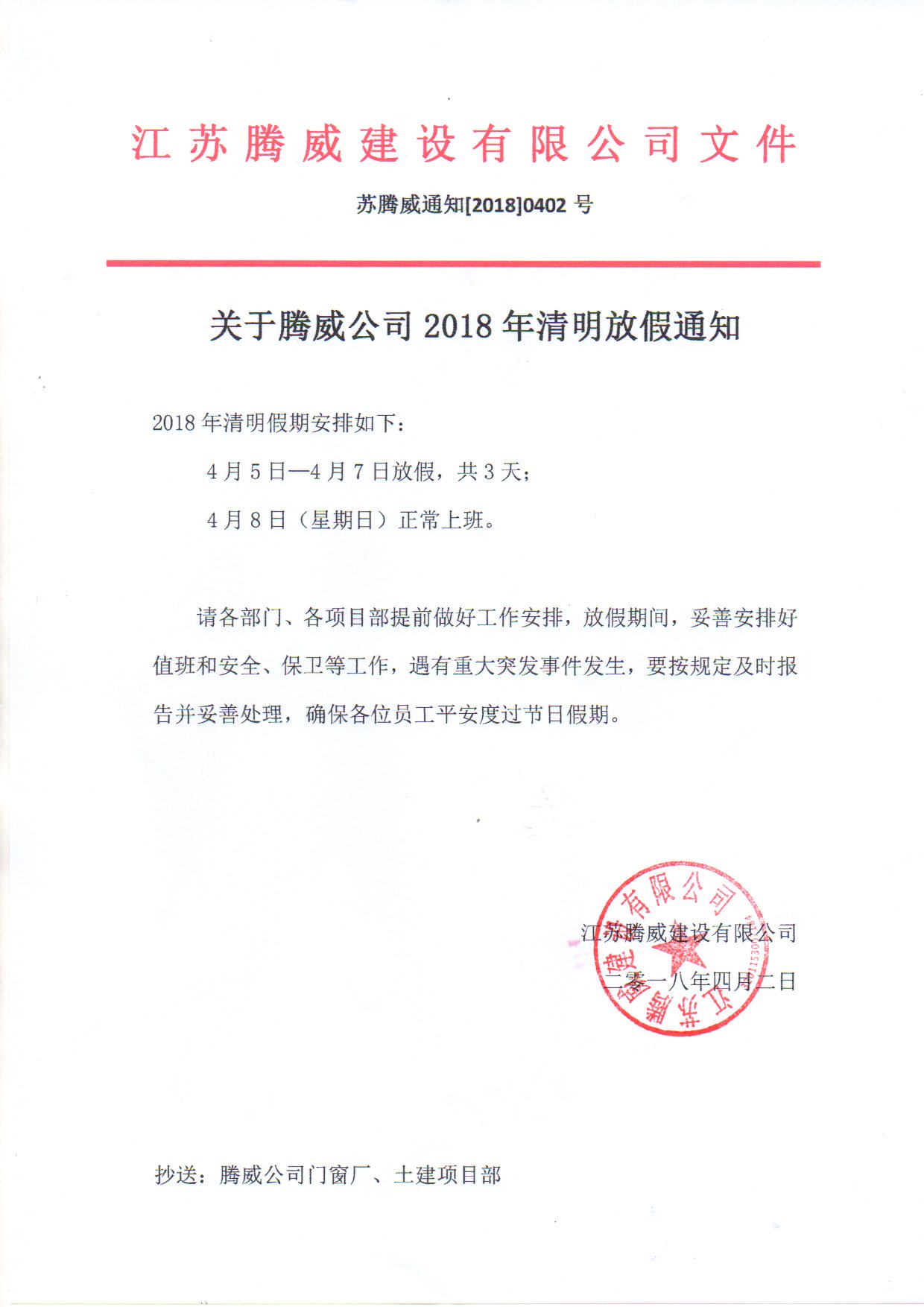 2018腾威公司清明放假通知