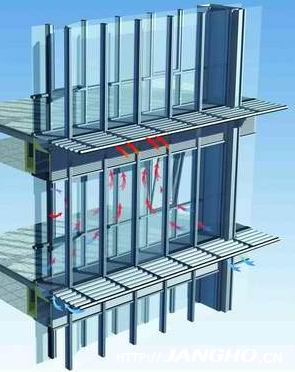 三、智能型呼吸式幕墙 该幕墙系统由内外两道幕墙组成,内幕墙一般采用明框幕墙、活动窗,或开有检修门;外幕墙采用有框幕墙或点支承玻璃幕墙。内外幕墙之间形成一个相对封闭的空间,大大提高了幕墙的保温、隔热、隔声功能。 智能幕墙是呼吸式幕墙的延伸,是在智能化建筑的基础上将建筑配套技术(暖、热、光、电)的适度控制,在幕墙材料、太阳能的有效利用,通过计算机网络进行有效的调节室内空气、温度和光线,从而节省了建筑物使用过程的能源,降低了生产和建筑物使用过程的费用。它包括以下几个部分:呼吸式幕墙、通风系统、遮阳系统、空调系统、环境监测系统、智能化控制系统等。 智能型呼吸式幕墙的关键在于智能控制系统,是从功能要求到控制模式,从信息采集到执行指令传动机构的全过程控制系统。它涉及到气候、温度、湿度、空气新鲜度、照度的测量,取暖、通风空调遮阳等机构运行状态信息采集及控制,电力系统的配置及控制,楼宇计算机控制等多方面因素。